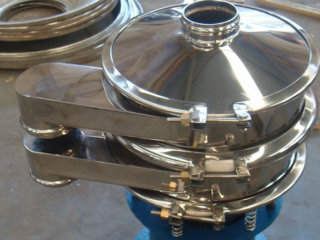 结构原理:该机由机座、参振两部分组成。机座部分由电动机、橡胶软节连轴器、振动器(轴承座及两端夹的重锤块)组成;通过弹簧连接参振部分上机座板,在上机座板上叠有筛圈、筛网架、用压紧锁紧固后连成一整体,物料由顶部进料口送入,在筛面上充分筛选后从出料口排出,出料口的位置可沿圆周方向任意改变,筛网架装有不同要求的丝网目数,采用V型槽结构,